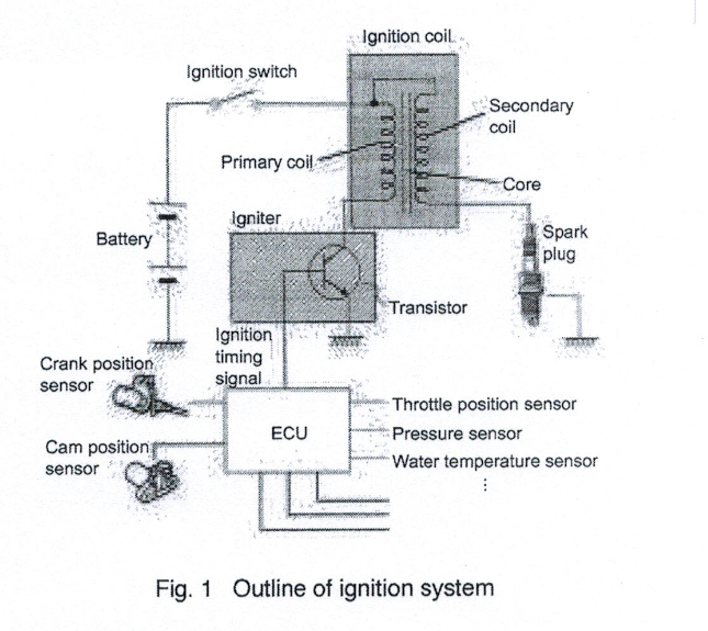 点火装置的概要如图Fig.1示,为了使高度压缩的混合气体产生电火花,必须在火花塞的两个电极之间加上高压,通过点火线圈产生高压,放电电压通常在10kV~15kV,最大也有超过30kV的。电流有在数十mA,比起点火的时机会使引擎的输出,发射都会发生变化,为了遵从各引擎条件最佳点火时机,对于点火线圈产生高压的时间进行控制是非常必要的,通过对电流通断的控制从而控制点火线圈产生高压,以各种传感器的信号为条件由ECU决定后执行点火。